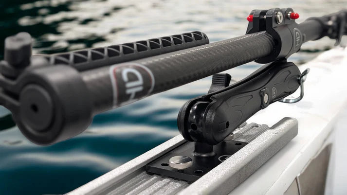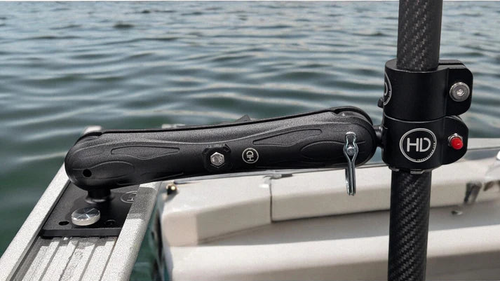 The HD UMS Combo is designed for the hardcore angler that is looking for flexibility while still maintaining strength and functionality. Solid aluminum components and stainless hardware provide allow trolling speeds up to 8mph! Proprietary designed sliding channels mixed with locking pin prevent twisting from the force of water. With a simple twist of the arm knob the pole can be securely stowed at any angle all while remaining ALWAYS CONNECTED.