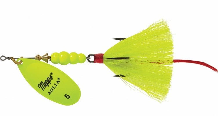 Size #4 and #5 Aglias are ideal for large rainbow trout and steelhead, as well as coho (silver) and chinook (king) salmon. Northern pike and giant tackle busting musky will inhale a dressed #5 Mepps spinner.