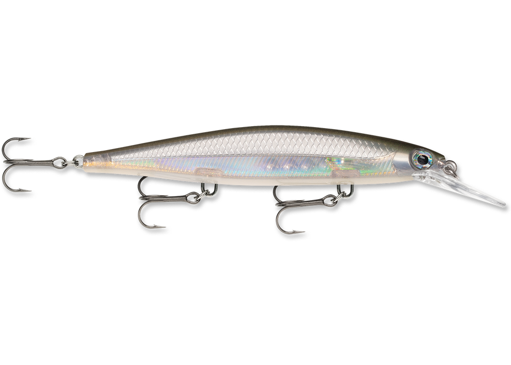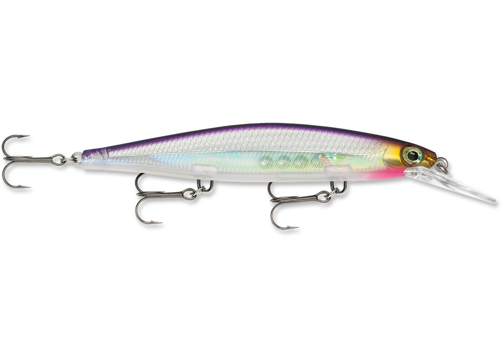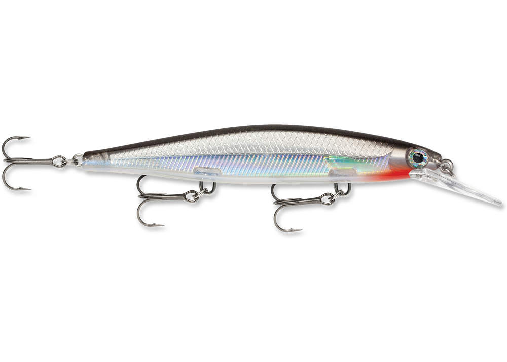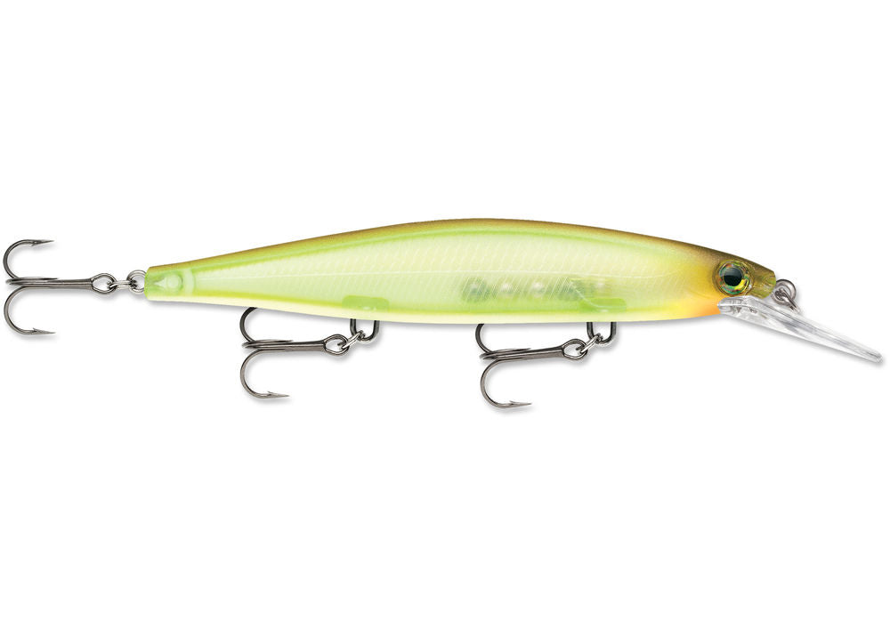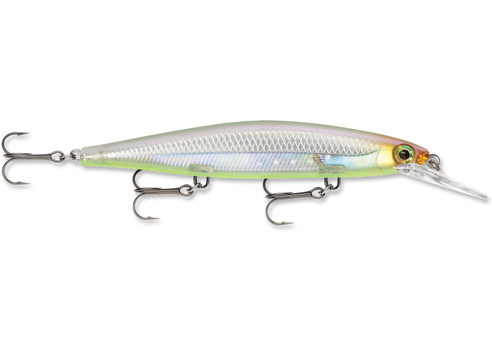 The Shadow Rap® Deep combines a horizontal struggle with a vertical fade that perfectly mimics a minnow in trouble in the 4-8 foot depth range. Rapala has perfected the natural minnow action in this new jerkbait that triggers fish in three ways: on the kick, on a slow fading fall and on the snap back to life. Most jerk baits continue on a forward plane with each jerk. Not the Shadow Rap® Deep. It kicks almost 180 degrees right then left, so it can be fished nearly in place with very little forward travel, keeping the flickering fade right in a fish's strike zone.