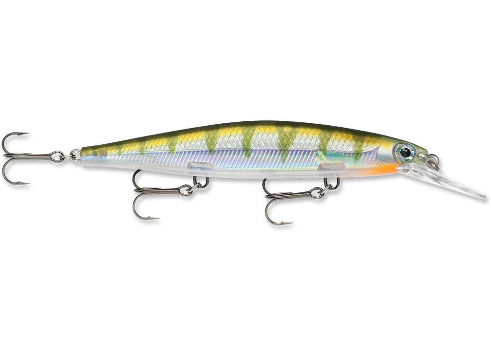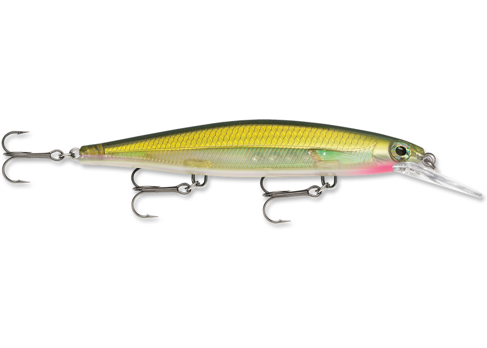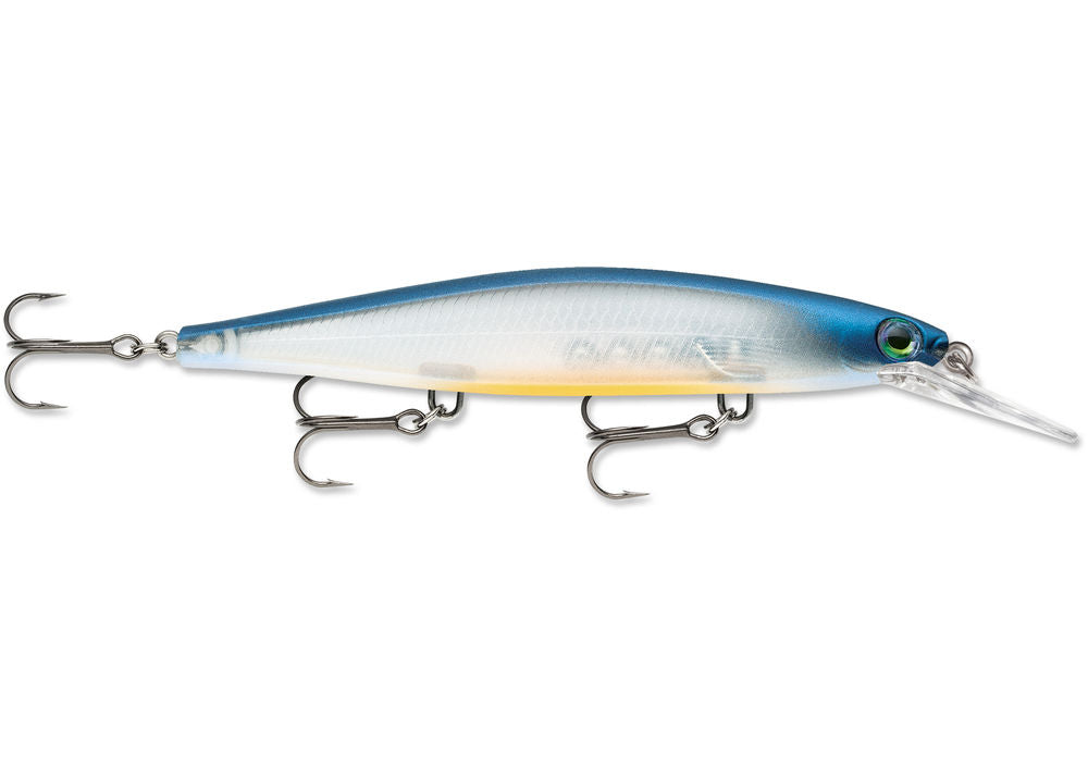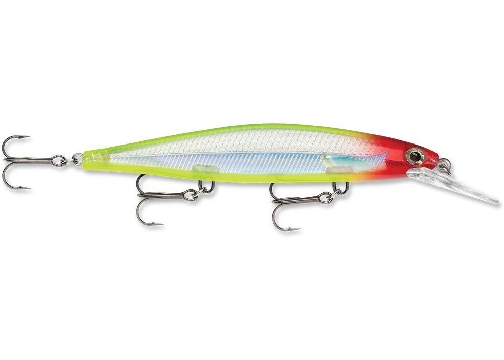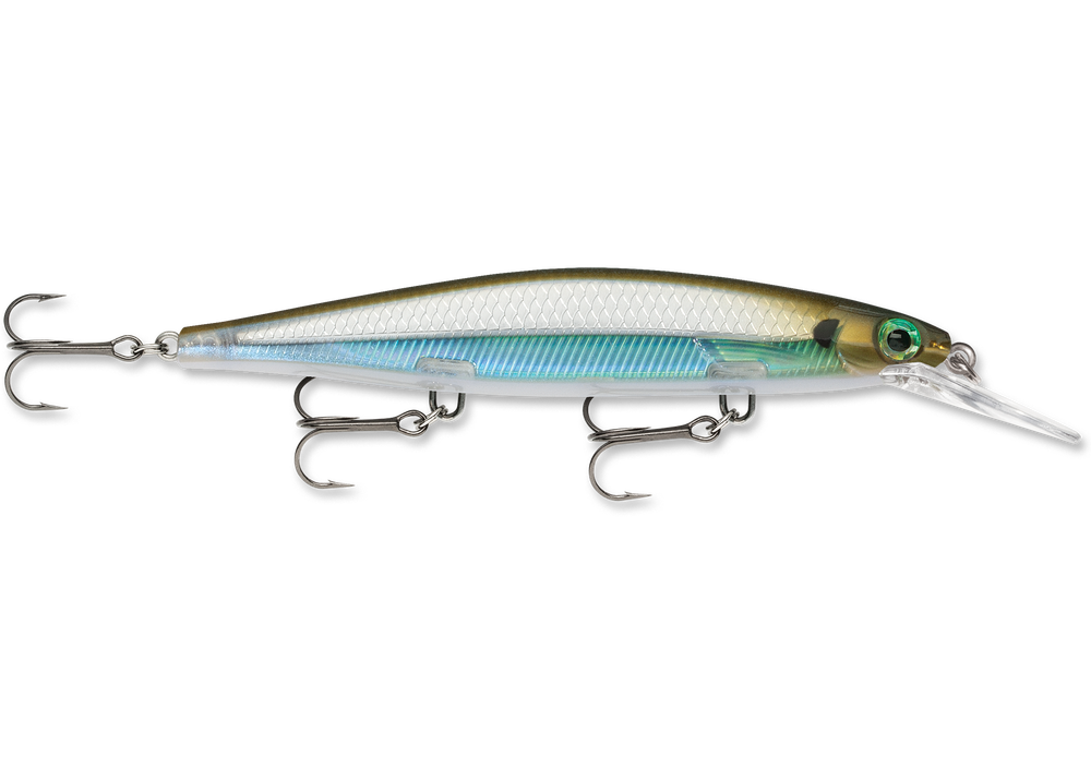 The Shadow Rap® Deep combines a horizontal struggle with a vertical fade that perfectly mimics a minnow in trouble in the 4-8 foot depth range. Rapala has perfected the natural minnow action in this new jerkbait that triggers fish in three ways: on the kick, on a slow fading fall and on the snap back to life. Most jerk baits continue on a forward plane with each jerk. Not the Shadow Rap® Deep. It kicks almost 180 degrees right then left, so it can be fished nearly in place with very little forward travel, keeping the flickering fade right in a fish's strike zone.