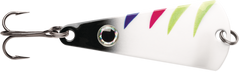 The VMC® Tumbler Spoon is the ultimate one-two punch lure. It's unique "knuckle" bend offers a slow tumbling action for those finicky biters or when a subtle action spoon is critical to matching the behavior of neutral to negative fish. The knock-out blow is the addition of the small metallic attractor blade which adds additional flash and sound when coming in contact with the spoon and hook. Holographic Ultra Glow colors lasting up to 15 minutes, UV finishes, natural baitfish patterns, and holographic eye match the hatch to any fishing condition either on open water or under the frozen tundra!