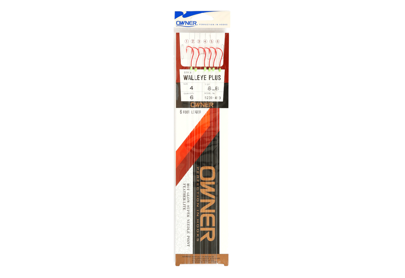 Walleye Plus Snells, designed for the pros, feature a feather light, super sharp hook, with a green glow bead covering and protecting the knot. Eight feet of leader, and the hooks come in either red or chartreuse glow.